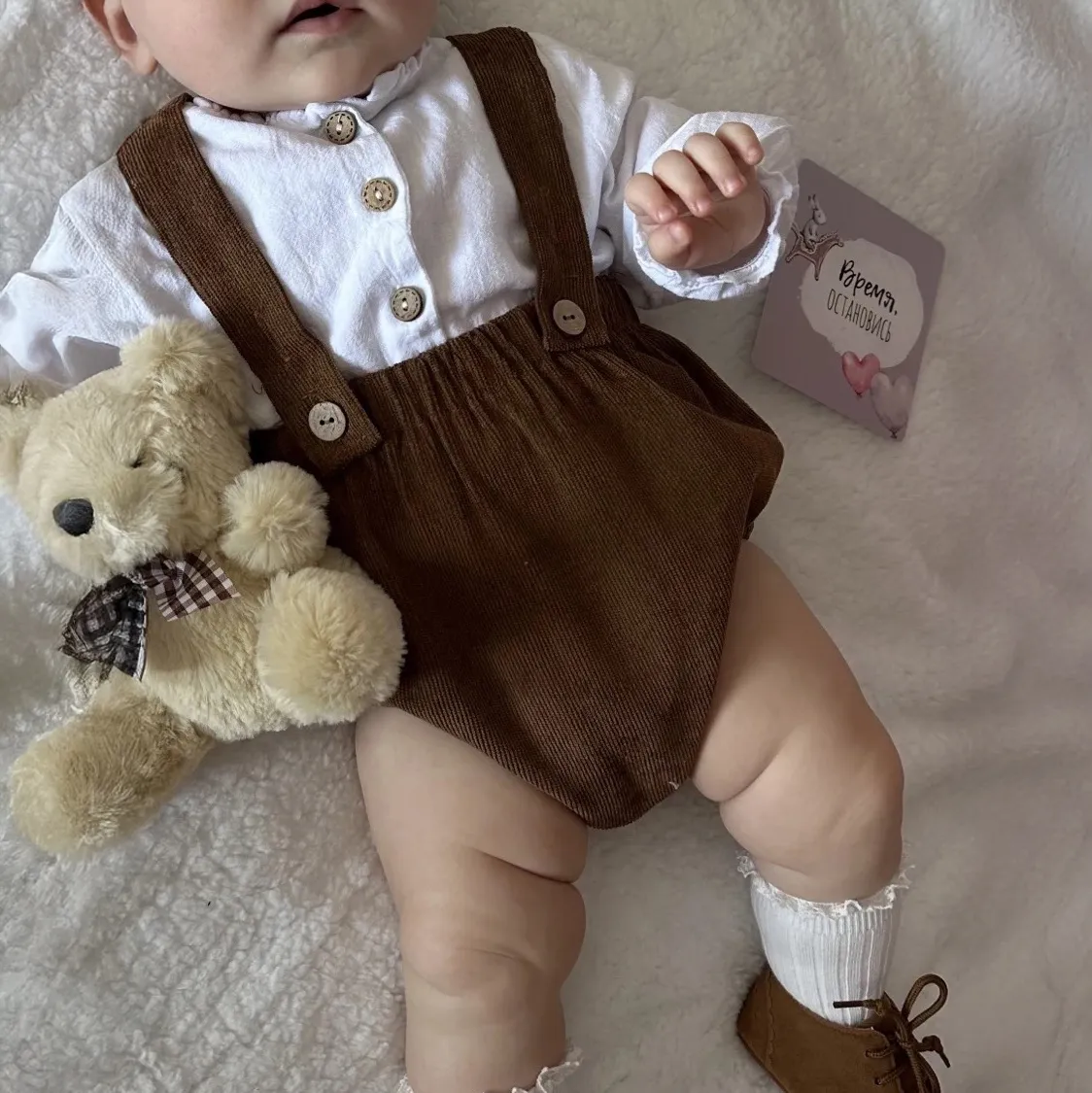 À associer avec un joli t-shirt blanc, un body à col claudine ou un petit pull, cette tenue bébé mixte est parfaite pour une séance photo, une cérémonie ou simplement pour le quotidien, avec une touche chic et intemporelle.