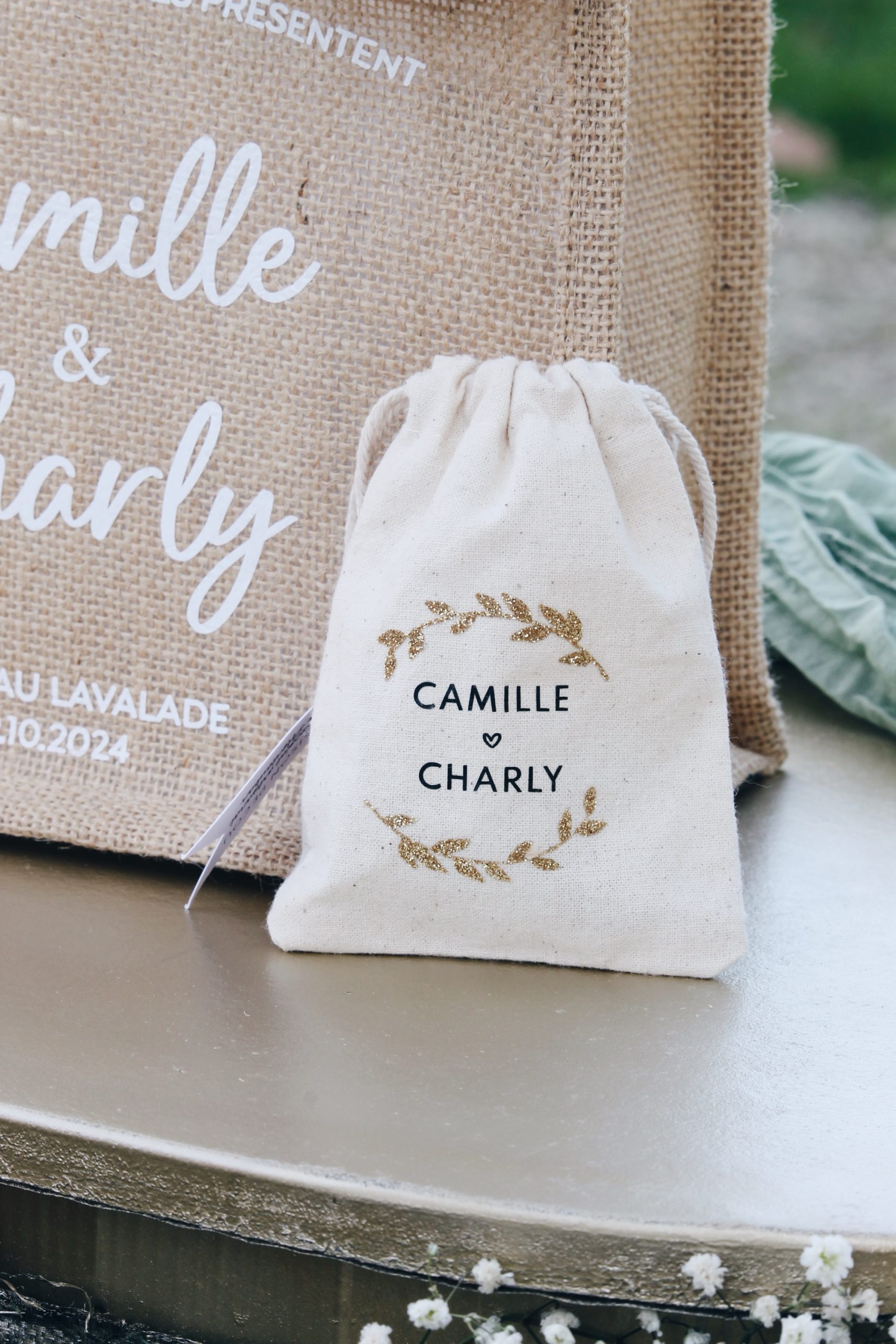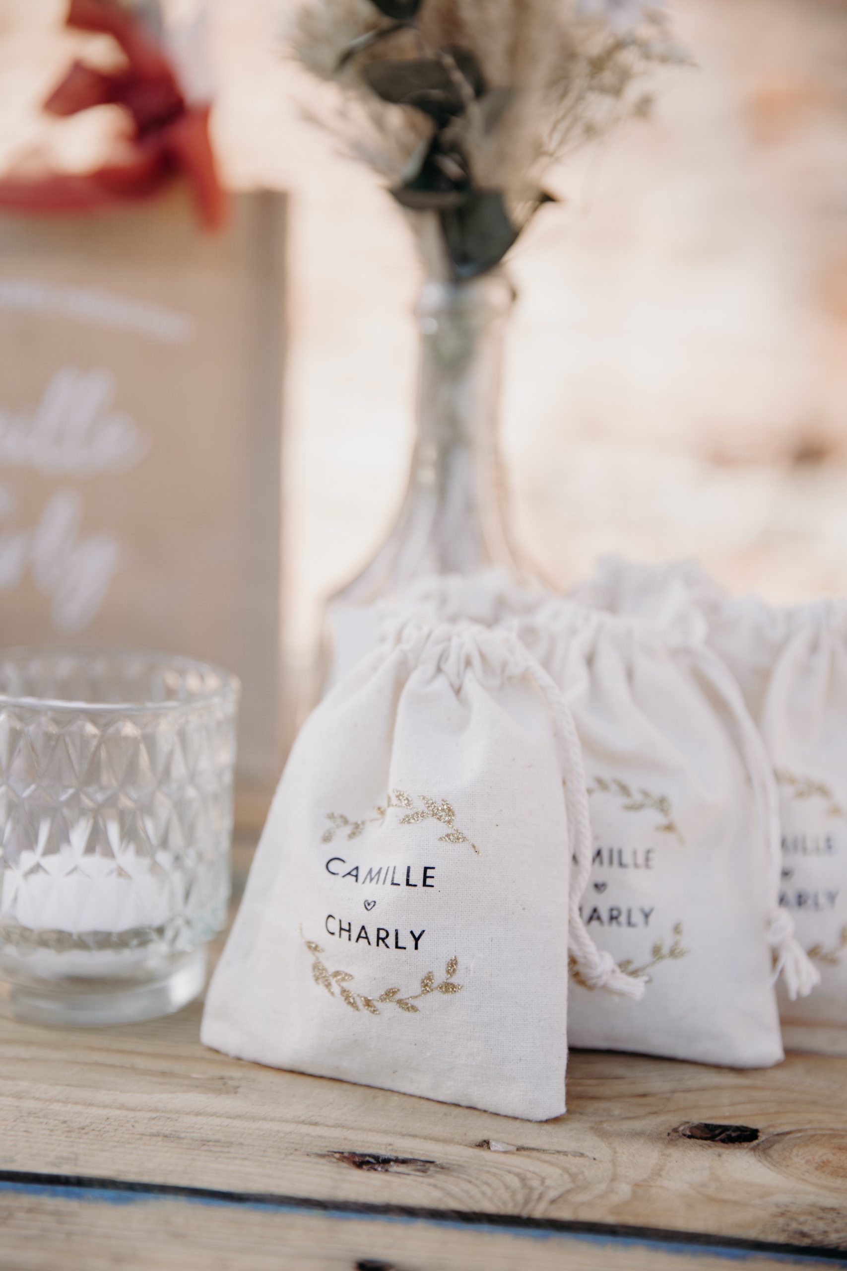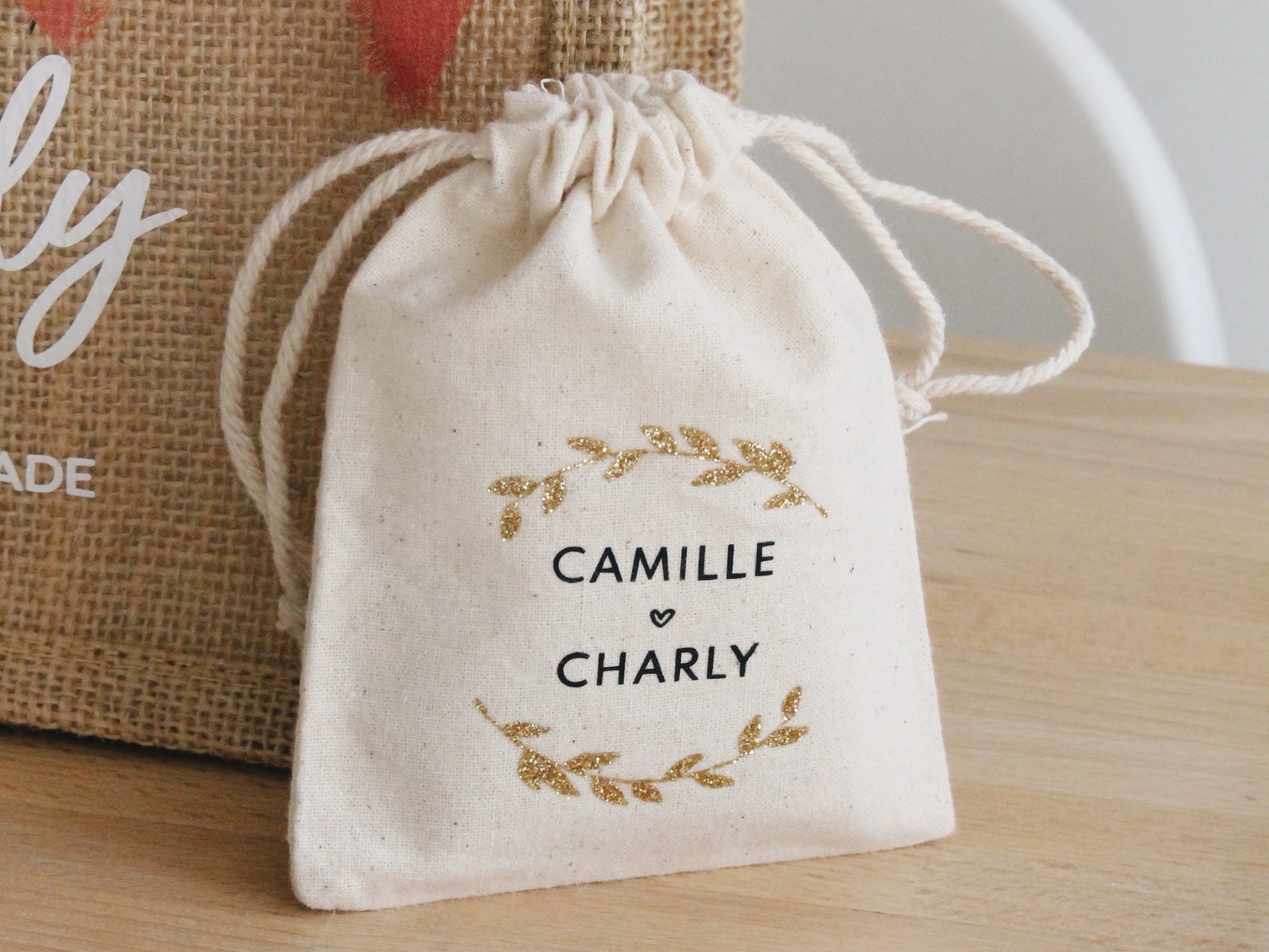 Chaque pochon est soigneusement personnalisé dans mon atelier avec une attention particulière portée à chaque détail, pour un souvenir durable et unique de votre mariage.