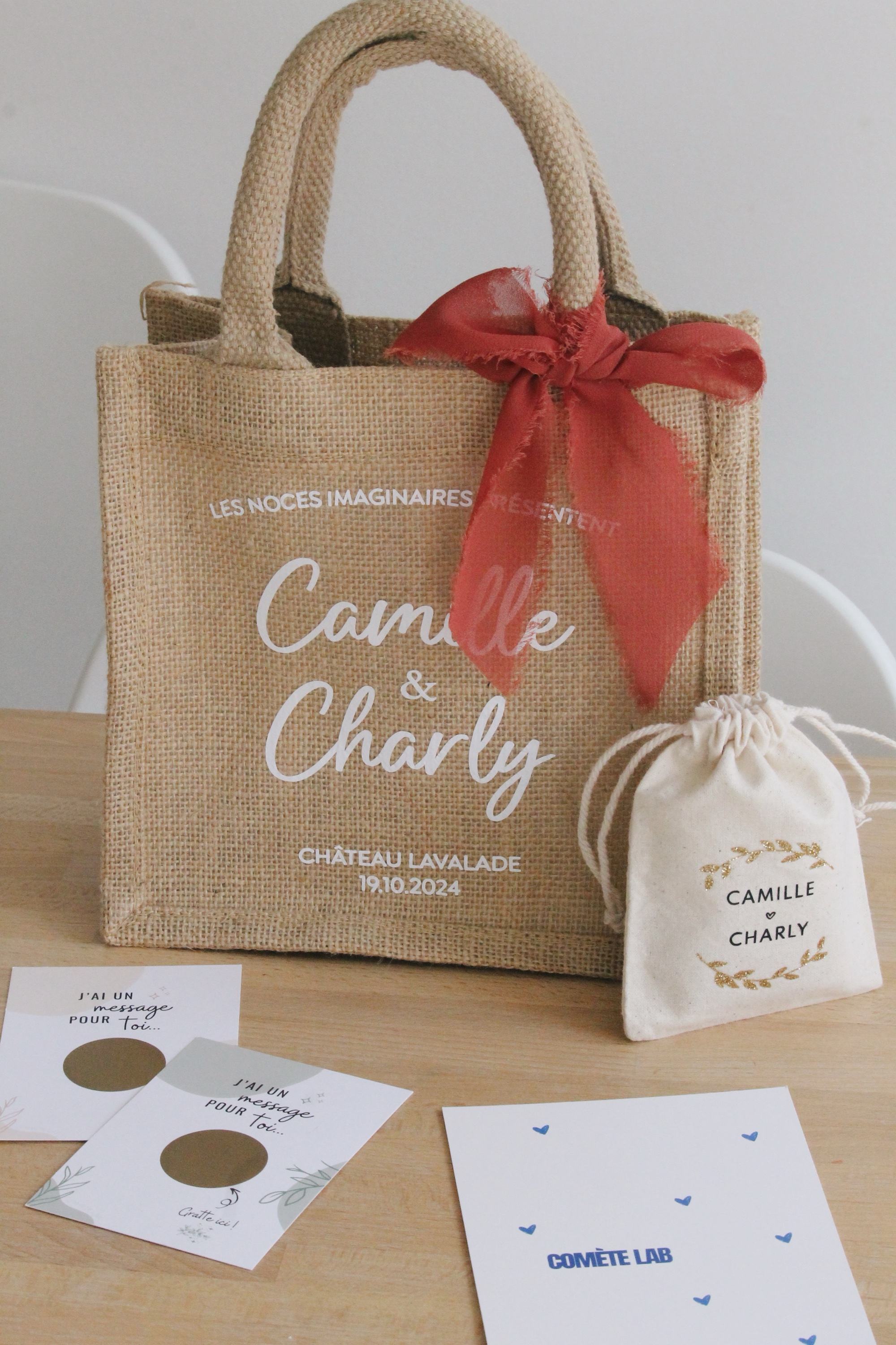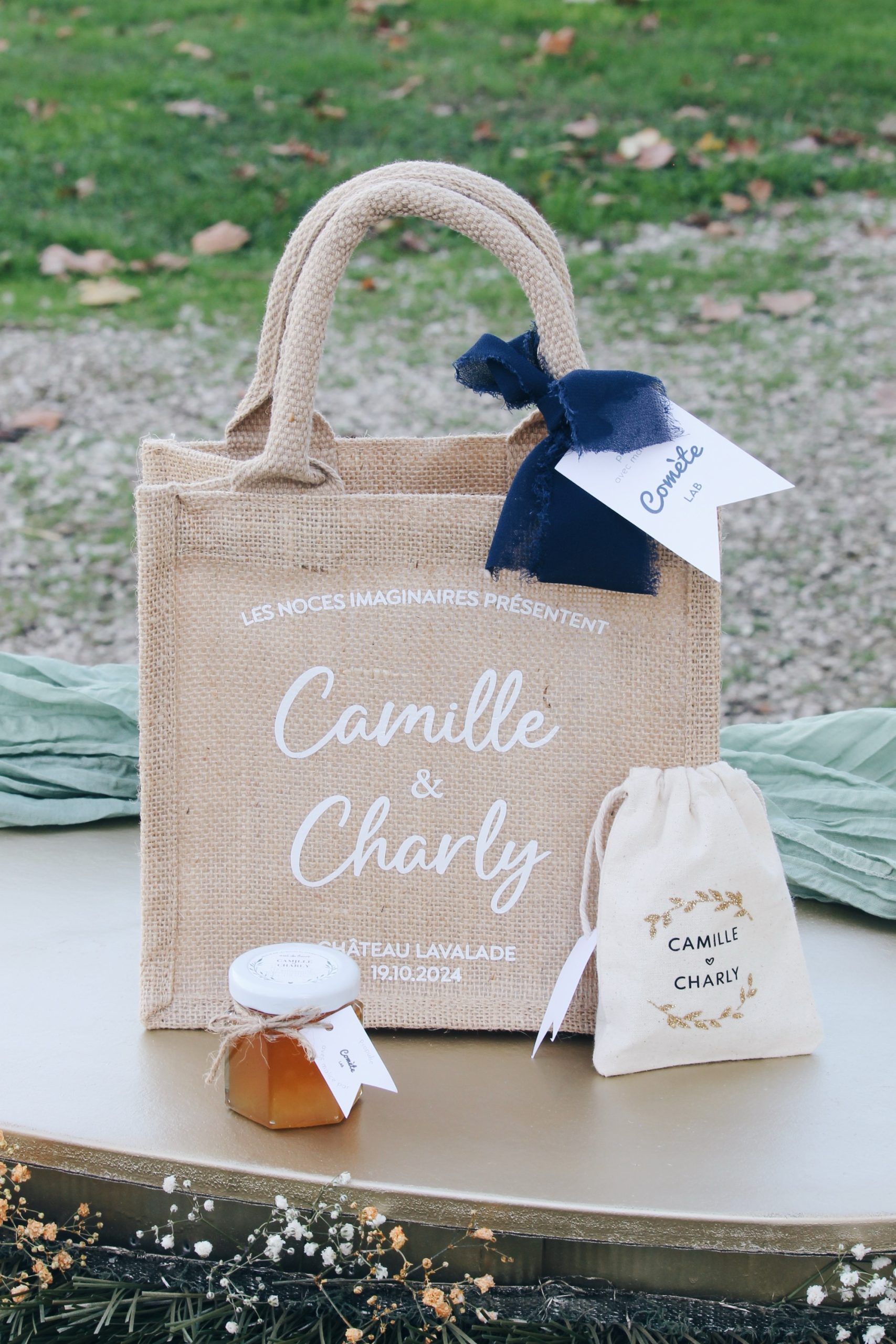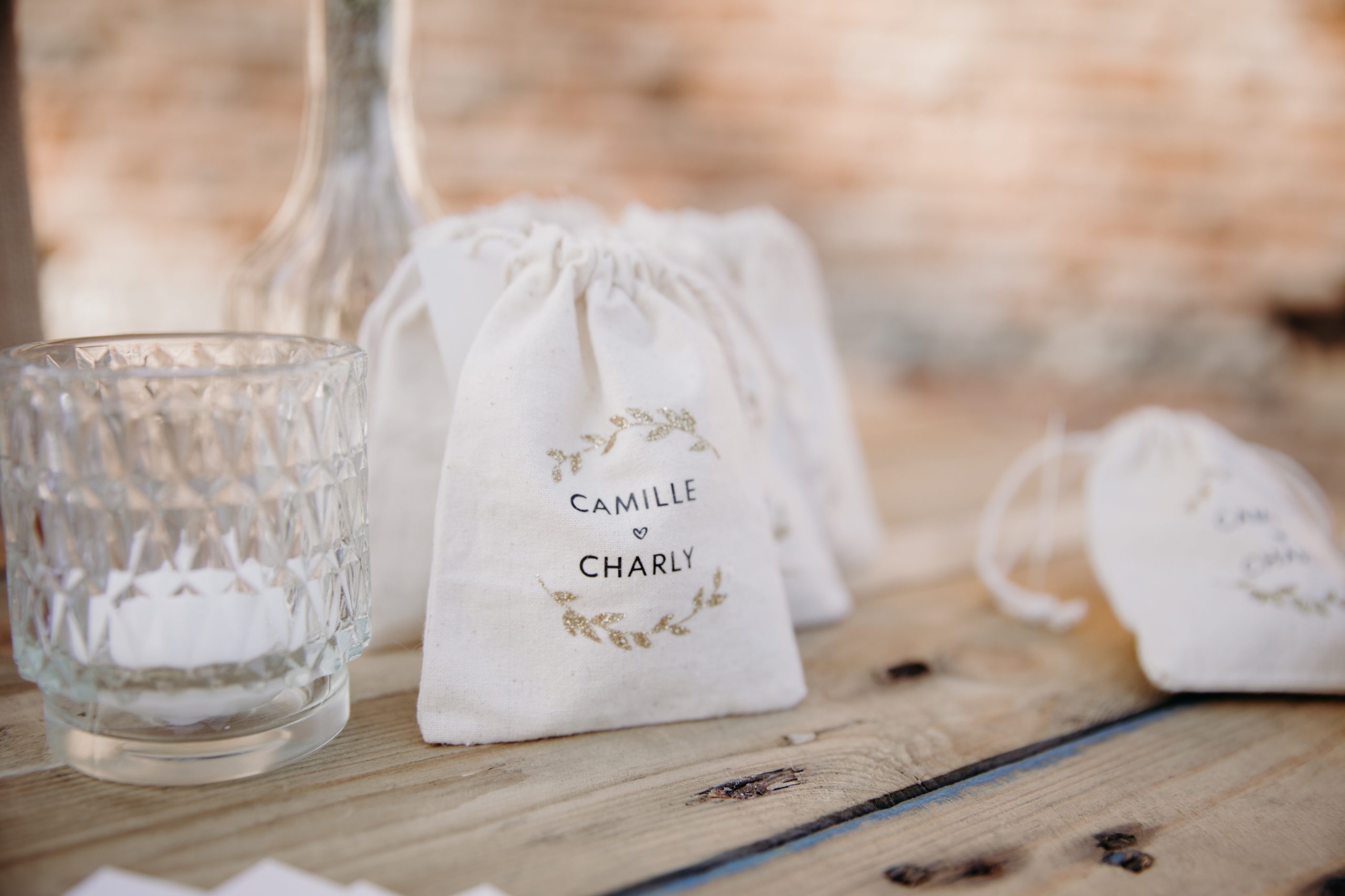 Chaque pochon est soigneusement personnalisé dans mon atelier avec une attention particulière portée à chaque détail, pour un souvenir durable et unique de votre mariage.