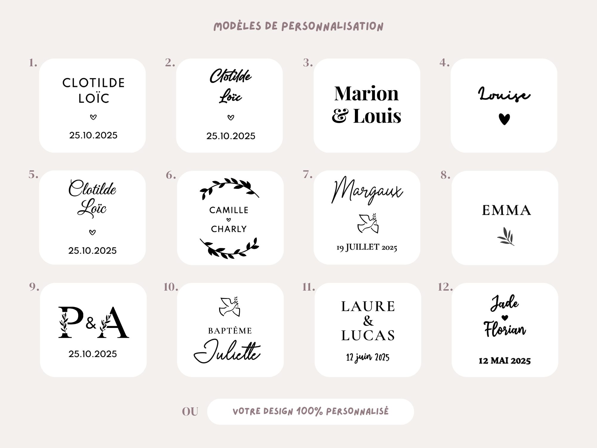 – Indiquez les prénoms des mariés, la date du mariage, ou tout autre texte de votre choix